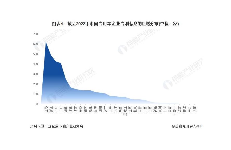 根據(jù)中國企業(yè)數(shù)據(jù)庫企查貓,目前中國專用車有相關(guān)專利信息的企業(yè)主要分布在江蘇和浙江等地。截至目前,江蘇省共有 621 家企業(yè)擁有專利相關(guān)信息,而浙江則有 487 家企業(yè)擁有專利相關(guān)信息。
